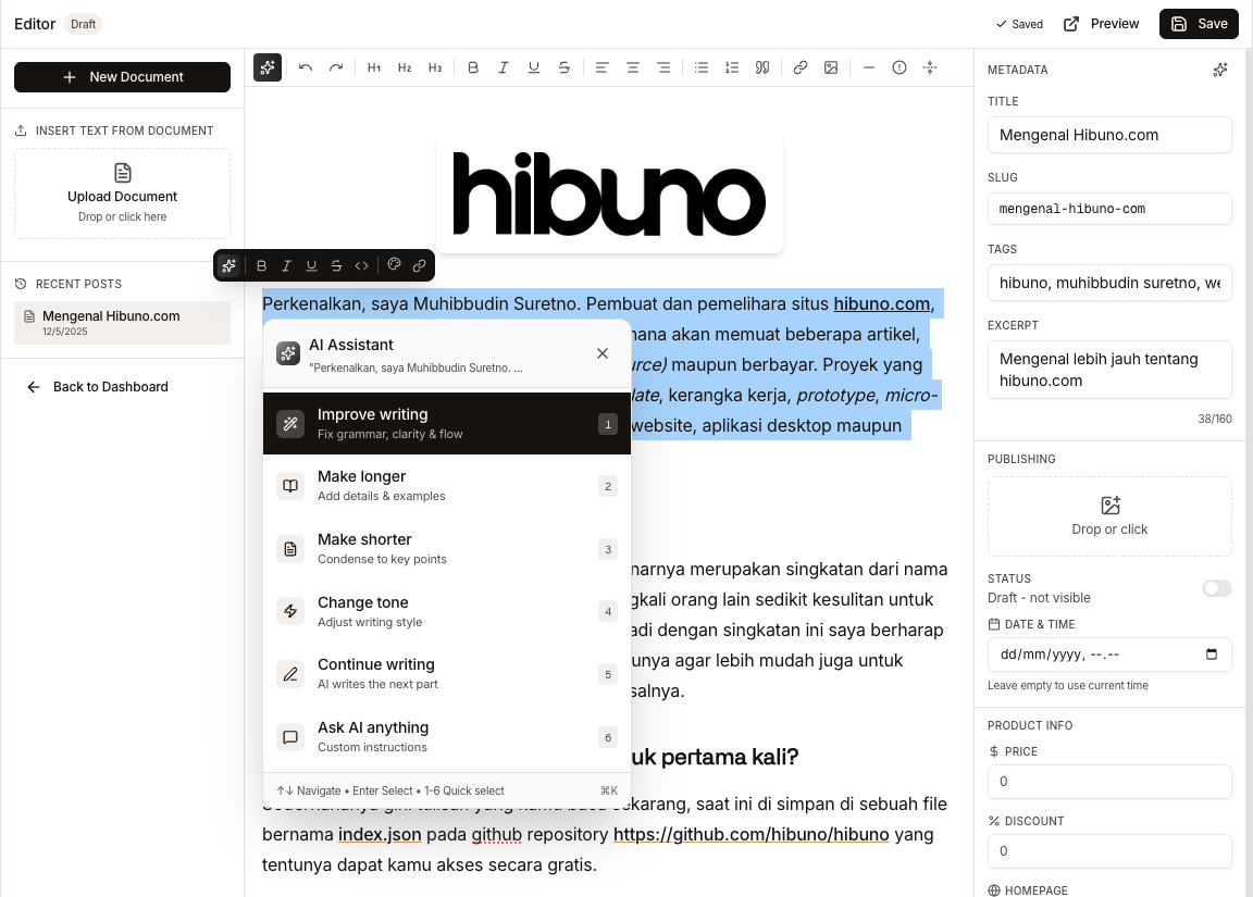 Simply put, the text you're reading now is stored in a file called index.json in the repository https://github.com/hibuno/hibuno, which you can access and learn for free. So, I set out to create my own content management system that's easy to use, loads very quickly, is inexpensive (read: free), can run on Vercel, Netlify, or other providers, and includes an AI-based text editor.